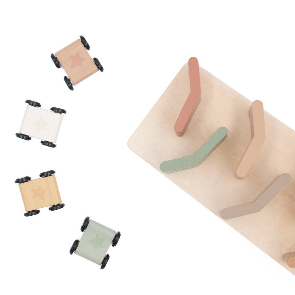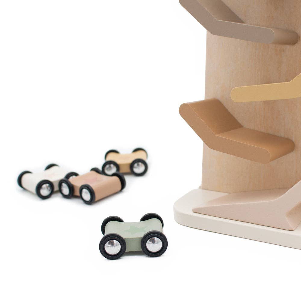 Watch the wooden cars race down the zigzagging tower tracks!